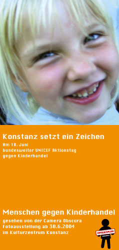 Am 18. Juni 2004 sind in Konstanz im Rahmen des bundesweiten UNICEF-Aktionstages gegen Kinderhandel viele Schüler mit schwarzen Pappfiguren, die den Stempel UNVERKÄUFLICH tragen, unterwegs. Sie machen auf die weltweite Ausbeutung von Kindern durch Menschenhändler aufmerksam und fordern, Kinder vor Ausbeutung, Gewalt und Prostitution zu schützen. Um dieser Forderung Nachdruck zu verleihen und die Bundesregierung zu verstärkten Anstrengungen im nationalen und internationalen Kampf gegen dieses skrupellose Geschäft zu bewegen, sammeln sie Unterschriften gegen Kinderhandel. 1,2 Millionen Kinder werden jährlich verkauft - Tendenz steigend.